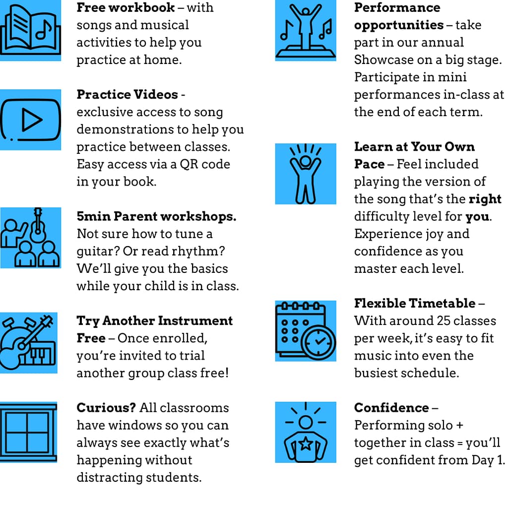 | “The free Practice Videos mean my daughter can work on songs between classes knowing she’s doing it correctly, and if we miss a class, we can easily catch up.” |