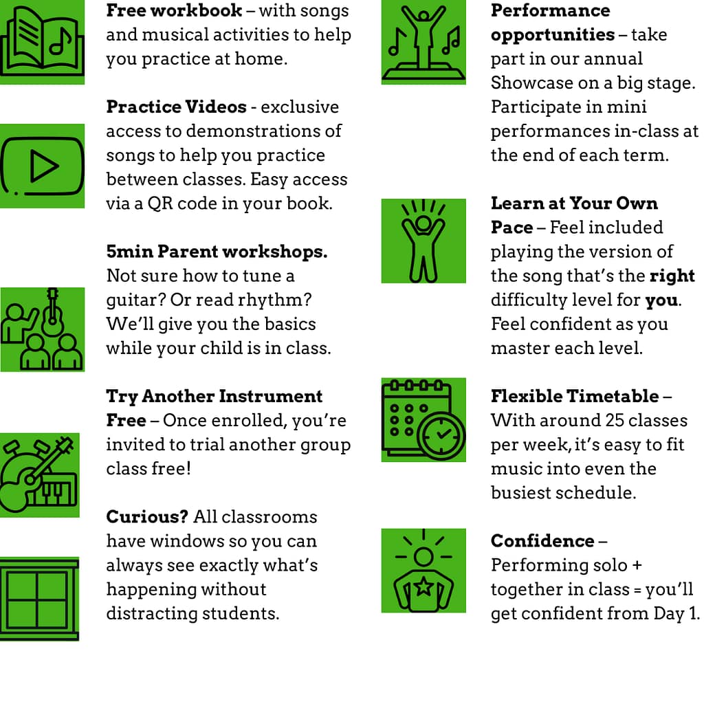 “Sound Before Sight” encourages your love of music and supports early “wins” playing the guitar. Just like you learnt to speak before reading and writing, in this class, we learn to play and love music first. (Formal music reading is introduced later.)